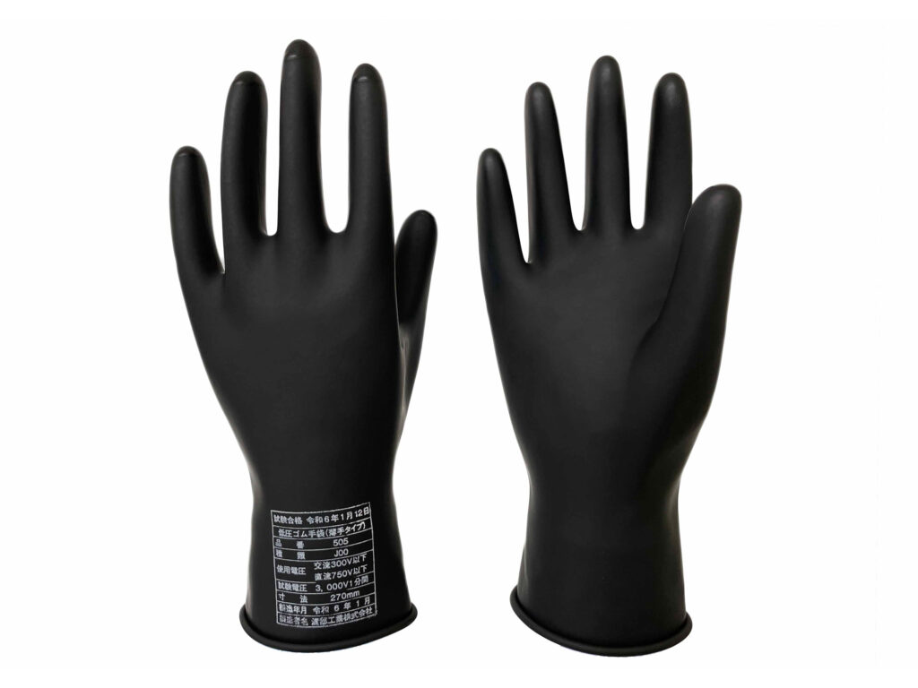 直流300V以下の補機系統など低電圧の回路であれば、低圧用の絶縁手袋で対応可能です。具体的には渡部工業の507型や505型が該当し、いずれもJIS T8112クラス J00に適合した手袋です。厚み約1.1mmの標準タイプ507型は交流300V/直流750V以下に使用でき、内部配線やコンデンサ点検などに適しています。より薄手の505型は作業性が高く、小さなボルトの着脱や狭所での作業に向いていますが、同じく直流750Vまでの絶縁性能を備えており安全性も万全です。300V以下の作業では、こうした低圧カテゴリの手袋を使うことで安全性と効率を両立できます。
