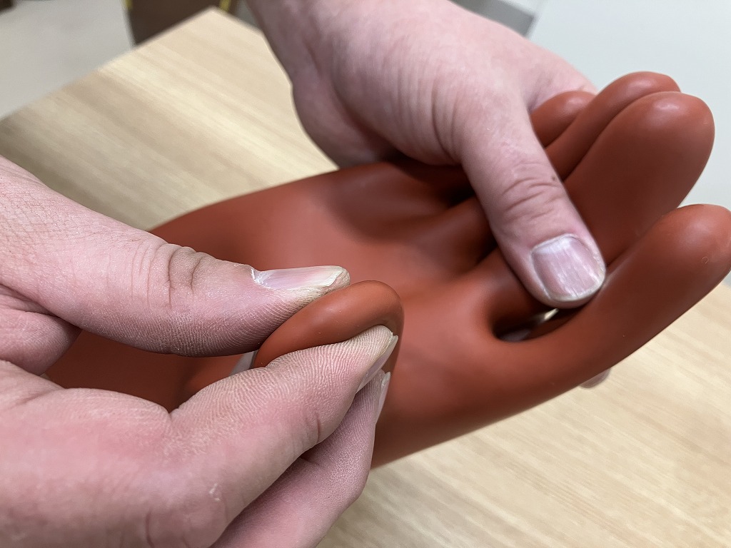 法定の定期検査が不要な絶縁手袋であっても、作業者自身による使用前の点検は必須です。絶縁性能は経年劣化や損傷で低下するため、毎回の作業前に異常がないか確認しなければなりません。「点検不要」の製品でも「何もしなくてもずっと安全」ではないことを肝に銘じましょう。