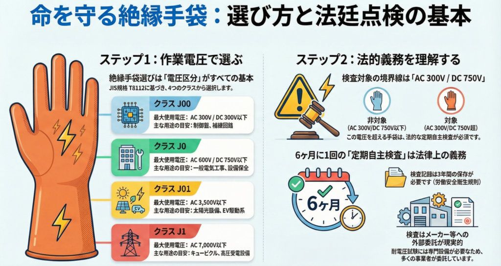 絶縁手袋は、電圧区分に応じて正しく選ぶことで、初めて本来の安全性能を発揮します。